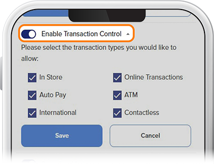To allow/disallow certain types of transactions, slide the “Enable Transaction Control” toggle to "On," check the boxes next to the transaction types you’d like to allow and uncheck those to block, then press Save.
