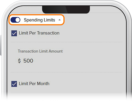 To set spending limits on your card(s), slide the "Spending Limits" toggle to "On," fill in transaction limits per transaction, per month (or both), then press Save.