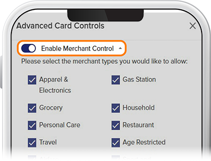 To allow/disallow transactions with pre-defined merchant categories, slide the “Enable Merchant Control” toggle to “On,” check the boxes next to the merchants you’d like to allow and uncheck those to block, then press Save.