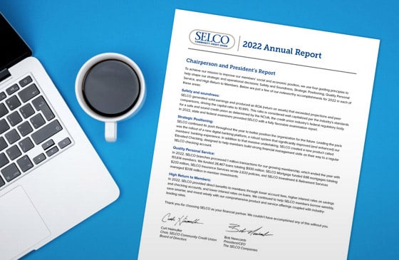 The Annual Report demonstrates the credit union’s commitment to Safety and Soundness, Strategic Positioning, Quality Personal Service, and High Return to Members—four guiding principles that are the foundation of SELCO's mission to improve our members’ social and economic position.