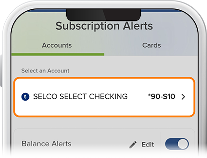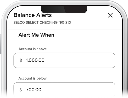 From here, you can set alerts for balances (pictured), pending ACH transactions, loans due, and more. These alerts can be sent once a threshold is reached or recurring until the amounts are within the threshold.