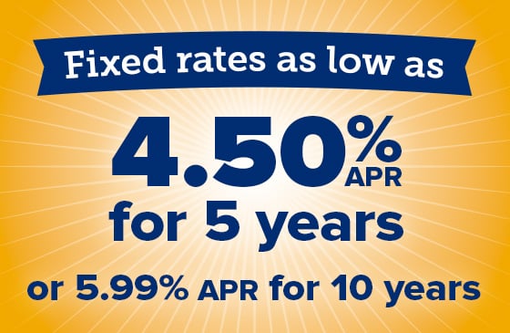 Choose between a rate as low as 4.50% APR for 5 years or 5.99% for ten years* when you open a HELOC, draw funds, and convert your balance to a fixed loan. We’ll pay most closing costs and waive your annual fee for 5 years.*